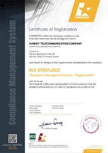 حصلت stc على شهادة ISO 37301:2021 لأنظمة إدارة الامتثال، كأول شركة تحصل عليها على مستوى الكويت. ويُبرهن الحفاظ على هذه الشهادة على التزام الشركة بأعلى المعايير في نظم الحوكمة والسلوك الأخلاقي والامتثال التنظيمي.